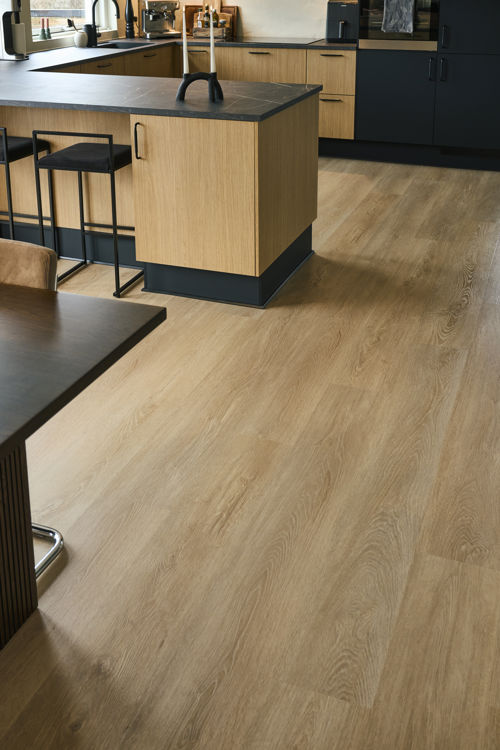 – Har du et køkken med træfronter, kan du vælge et gulv med en kontrasterende træsort for at skabe dybde, eller du kan gå tone-i-tone for at opnå et roligt og sammenhængende udtryk. Hvis køkkenet har hvide eller farvede fronter, giver et varmt gulv med trælook balance og tilfører en naturlighed til rummet, siger stylisten.