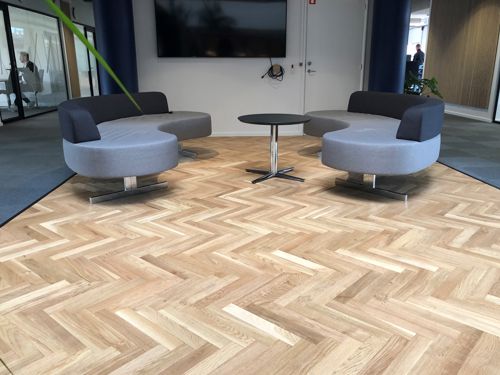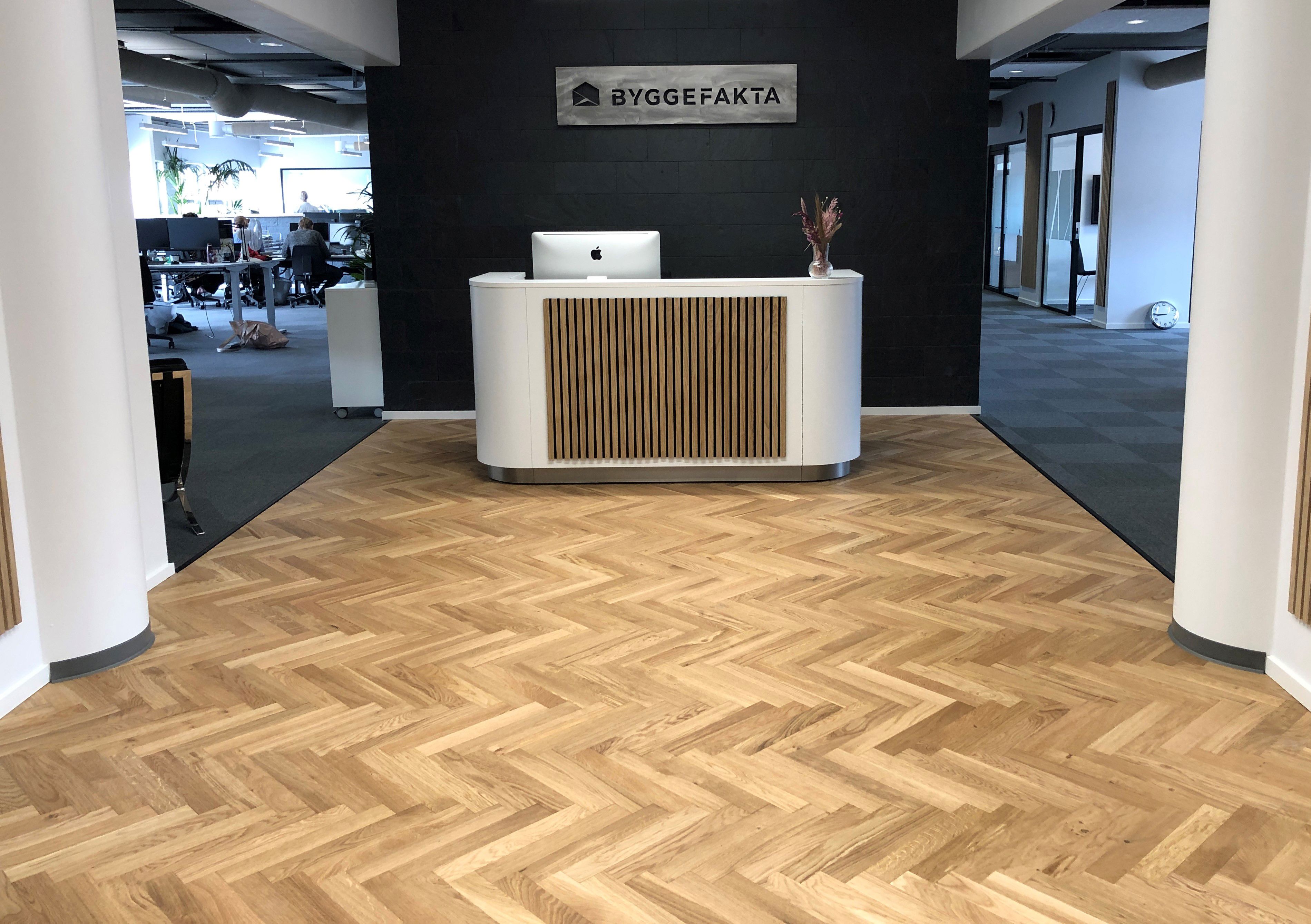 - I løbet af det seneste år har vi oplevet, at sildebensgulvene har været ekstremt populære hos særligt de private boligejere. Nu ser vi så, at tendensen også så småt begynder at sprede sig til virksomheder som Byggefakta og andre, der ønsker at bringe det eksklusive udtryk ind på arbejdspladsen. Et sildebensgulv i solid eg lagt stav for stav sender et signal til kunder og samarbejdspartnere om, at det går godt, og at virksomheden går op i kvalitet på alle fronter.