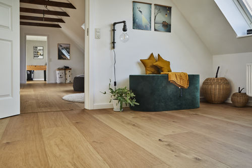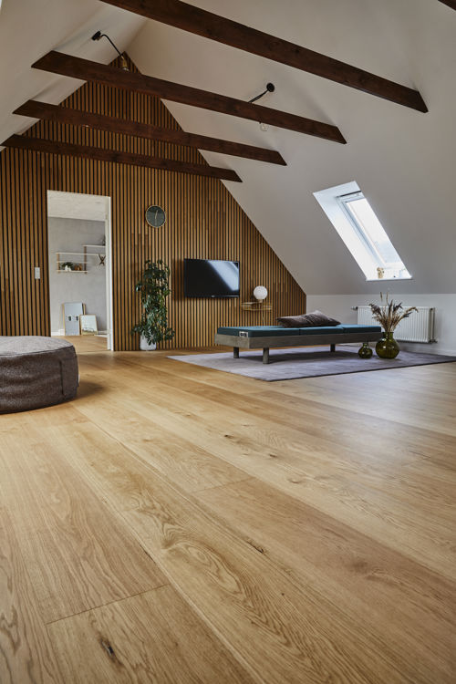 Julia er oprindeligt uddannet sløjdlærer, mens Thomas er maskinsnedker. Boligindretningen bærer derfor i høj grad præg af en forkærlighed for træ og andre naturlige materialer. Flere af hjemmets vægge er fx beklædt med trælister, køkken- og badeværelseselementerne er også i træ, mens et af Julias seneste projekter er en udskiftning af et gråt gulvtæppe på 1. sal med et nyt Innoplank-trægulv fra Timberman, som indtil videre har holdt til både væltede glas, potteplanter og skramlende stoleben.