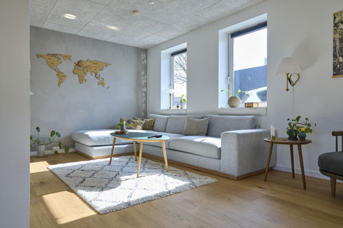 Boligen er indrettet i en lys nordisk stil med hvid, grå og træ som bærende elementer. Møblerne er sammensat af alt lige fra designklassikere som en Wegner-gyngestol og Louis Poulsen-standerlampe til moderne spisebordsmøbler og kreative DIY-projekter.