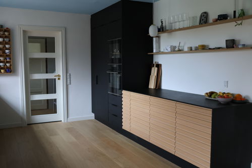 - Da vi renoverede i køkkenet, flyttede vi terrassedøren og måtte fjerne en radiator. Vi havde fået varmepumpe, og det fungerer rigtig godt med gulvvarme, så vi skulle finde et nyt gulv – og det var egentlig en ret nem opgave at finde smukke planker, der matchede stilen, vores ønsker til praktik og holdbarhed, lyder det fra Jesper Søvndal, og han tilføjer: