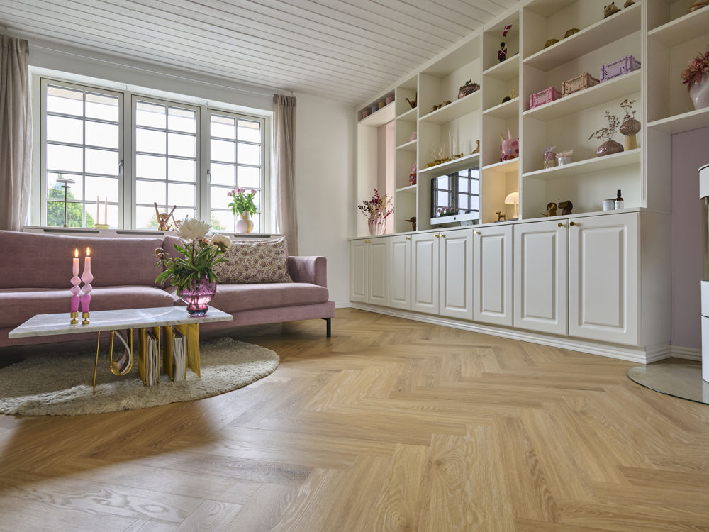 - Et sildebensgulv i naturligt egetræslook er for eksempel et klassisk design, som vil fungere i langt de fleste hjem med forskellige indretninger, tilføjer Martin Mosegaard.