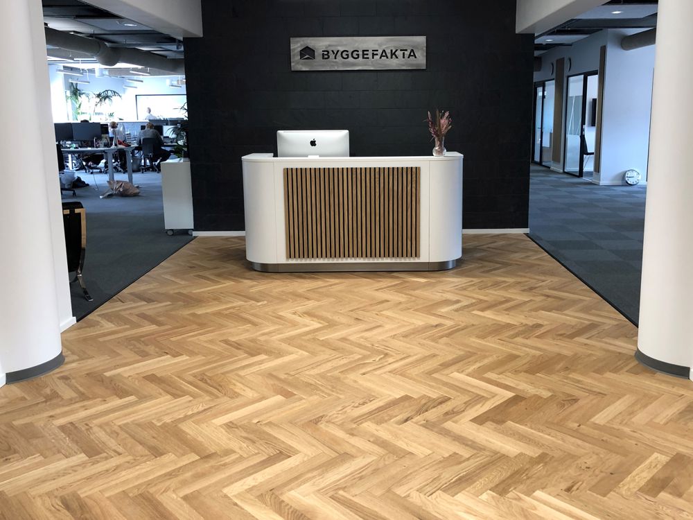 - I løbet af det seneste år har vi oplevet, at sildebensgulvene har været ekstremt populære hos særligt de private boligejere. Nu ser vi så, at tendensen også så småt begynder at sprede sig til virksomheder som Byggefakta og andre, der ønsker at bringe det eksklusive udtryk ind på arbejdspladsen. Et sildebensgulv i solid eg lagt stav for stav sender et signal til kunder og samarbejdspartnere om, at det går godt, og at virksomheden går op i kvalitet på alle fronter.