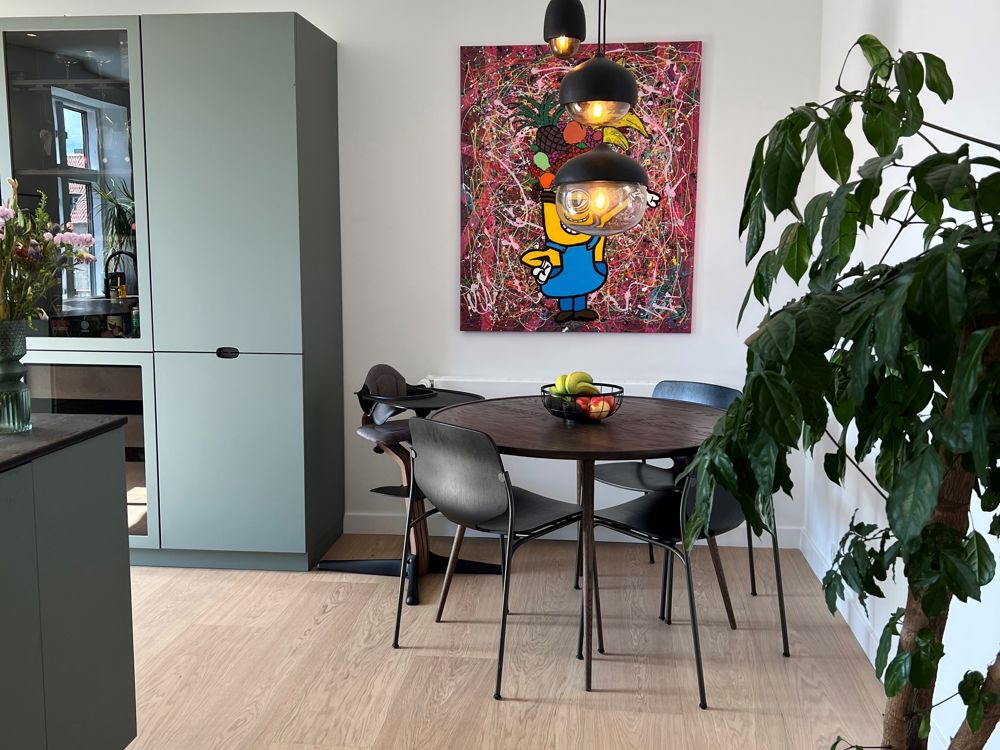 - Da vi begge har et kaotisk kunstnerisk indre, værdsætter vi virkelig et hjem med ro og styr på tingene. Af den grund har vi valgt at indrette os minimalistisk og være tro mod den skandinaviske stil med egetræsplankerne og afdæmpede farver på væggene – og på den måde bliver materialerne heller ikke yt lige foreløbig. Til gengæld har vi så skruet op for de skæve, personlige detaljer, når det kommer til møbler og nips, hvoraf størstedelen har en dybere betydning for os, forklarer hun.
