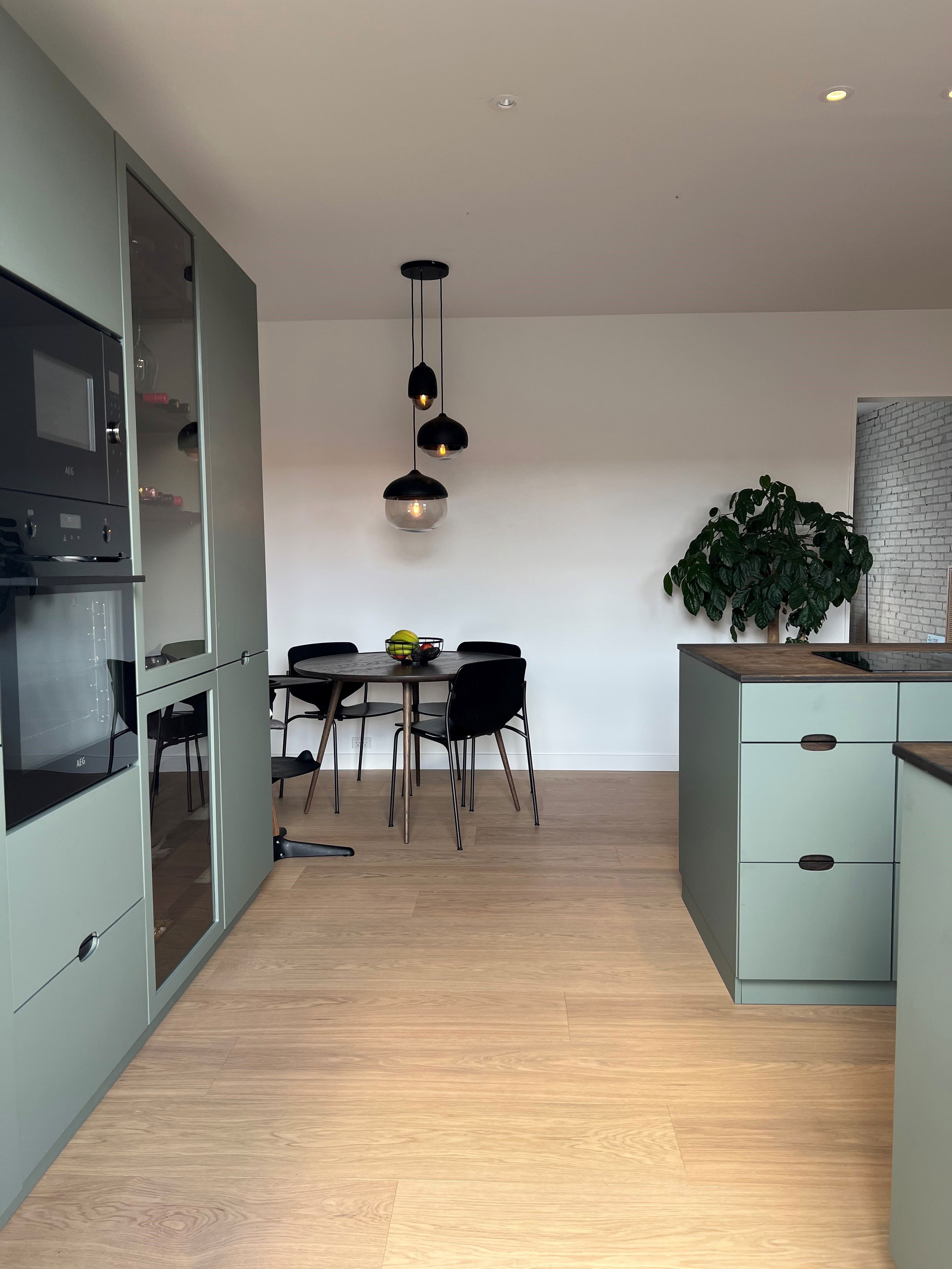 Et grønt køkken, fund med fortællinger og et smukt egetræsgulv har været grundstenene i skuespiller Simone Lykke og hendes kæreste Marcels renovering af en 110 kvm charmerende lejlighed på Amager. For at binde lejlighedens to etager sammen har parret ladet Timbermans plankegulv gå igen i hele hjemmet – og det giver et klassisk udtryk med moderne kant.