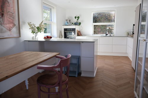 Novego Chevron er lagt i både stue, køkken, entre og soveværelse. Gulvet lagde Nanna Pretzmann selv efter tømreren, som skulle rette undergulvene, viste hvordan, og hun beskriver det som let, logisk og hurtigt at lægge.